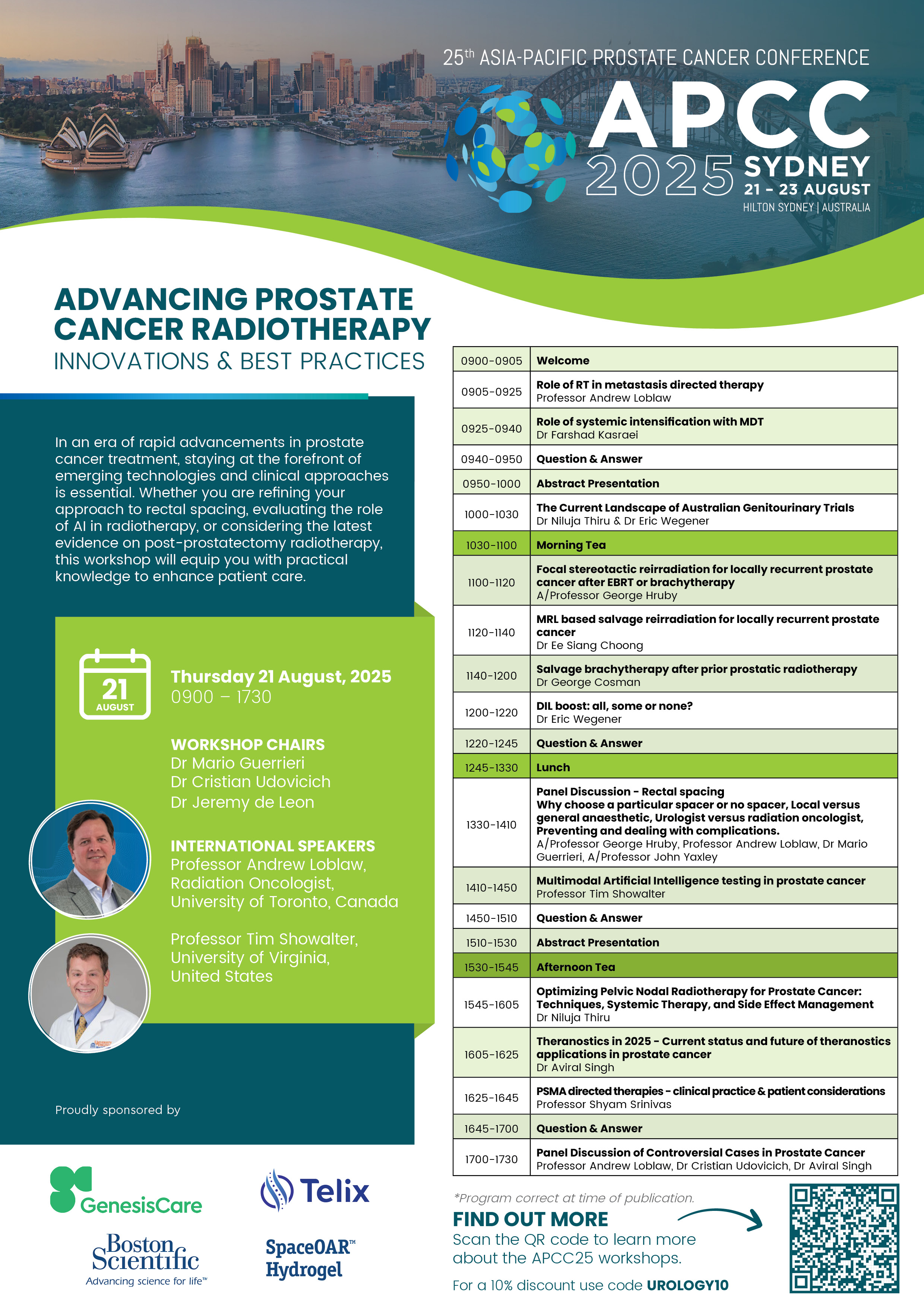 In an era of rapid advancements in prostate cancer treatment, staying at the forefront of emerging technologies and clinical approaches is essential. Whether you are refining your approach to rectal spacing, evaluating the role of AI in radiotherapy, or considering the latest evidence on post-prostatectomy radiotherapy, this workshop will equip you with practical knowledge to enhance patient care.